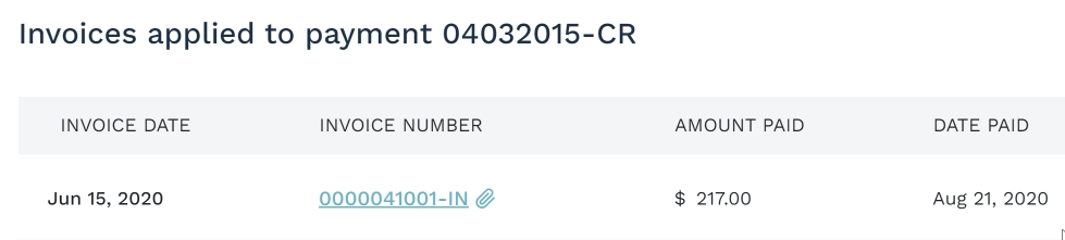 - You can click on the invoice number to view the details on the invoice payment was applied to.
