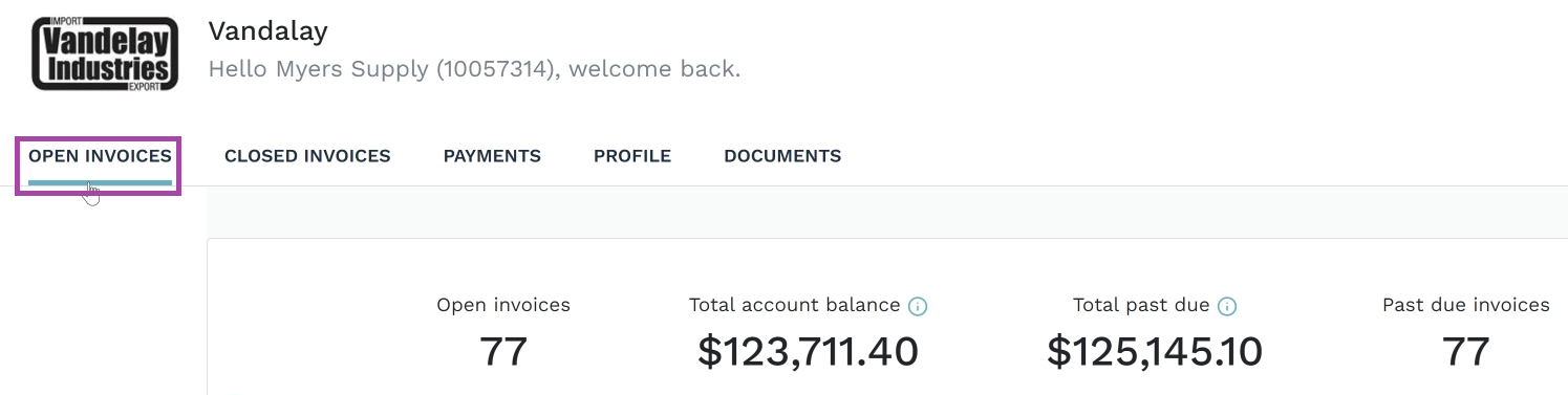 - Click the link Open Invoices at the top navigation bar. This will display all open invoices as well as the total past due, and the number of past due invoices.