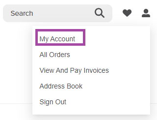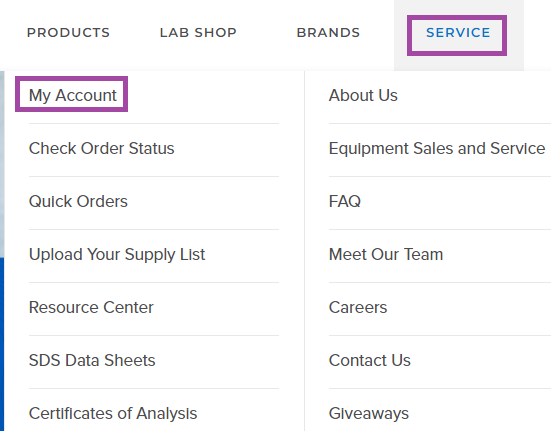 When you log into your account you will be routed to the Account Dashboard. You may also navigate to this page at any time from the Service menu by clicking My Account or using the person shortcut at the top and selecting My Account from the menu.